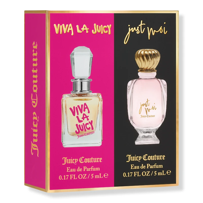 . Includes: Viva La Juicy Eau de Parfum Mini (0.17 oz). Just Moi Eau de Parfum Mini (0.17 oz). Fragrance Family: Viva La Juicy - Amber Floral Gourmand. Just Moi - Amber Vanilla. Key Notes: Viva La Juicy - Mandarin, Gardenia & Caramel. Just Moi - Cacao Blossom, Crme de Cacao & Exclusive Vanilla-Ambrox Co-Infusion.