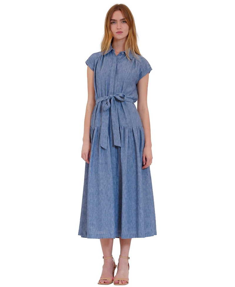 Collared styling and a button closure add tailored charm to this julia jordan dress with cap sleeves, tie-waist detailing, and midi length. The design delivers versatile elegance.