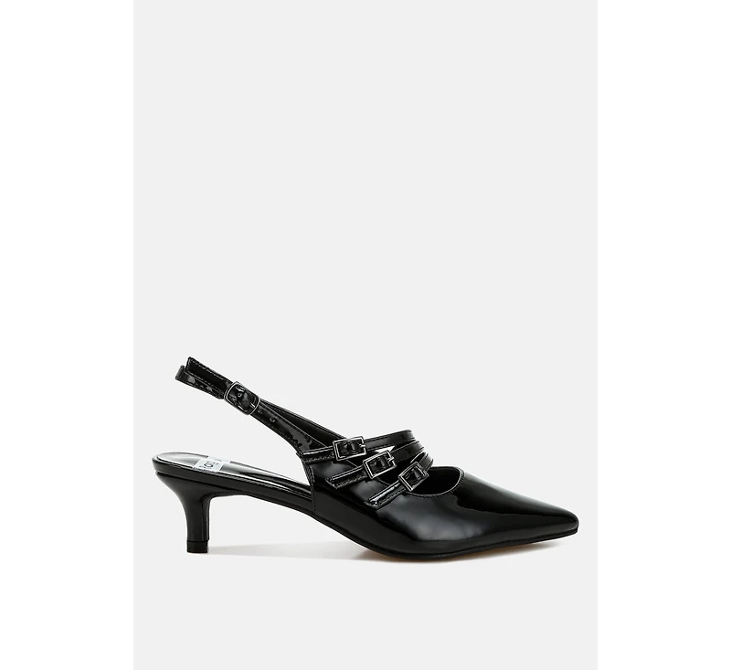 The one staple in every shoedrobe is a pair of versatile and stylish sandal. The triple strap on these slingback sandals elevates their visual appeal, seamlessly blending the sophistication of a kitten heel backstrap with the classic allure of Mary Janes. The short heel and comfortable cushion insoles offer a relaxed and comfortable fit.a Type: SandalsUpper Material: Patent PleatherOuter Sole: TPRClosed Pointed ToeKitten HeelsTriple Strap VampPin Buckle Slingback FasteningComfortable Cushion InsolesA Heel Height: 2 inchesRCSH5198