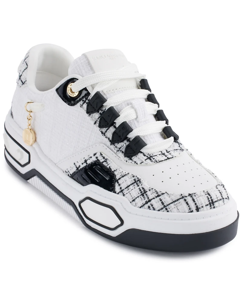 The Charna Lace-Up Sneaker by Karl Lagerfeld Paris features elegant tweed panels and eye-catching logo details. These sneakers blend modern flair with timeless sophistication, offering style and comfort perfect for any occasion.