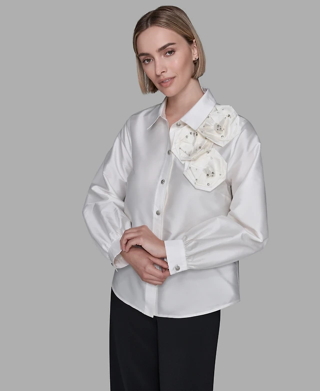Karl Lagerfeld Paris Women's Collar Rose Applique Detail Top