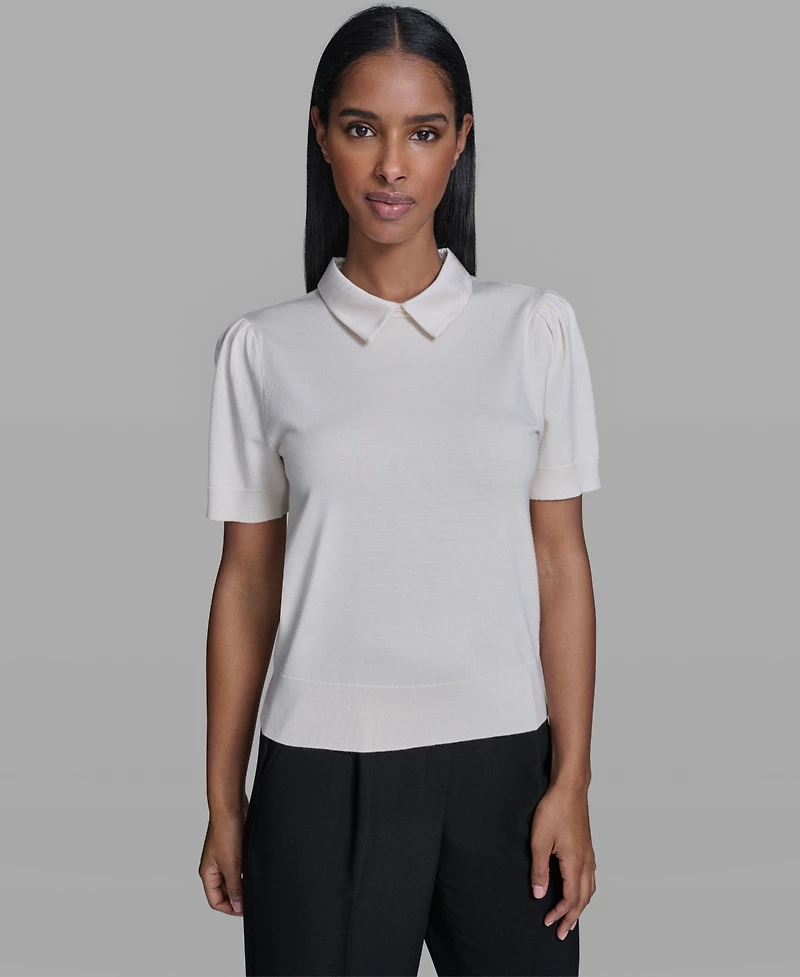 Bring a structured edge to your look with this Karl Lagerfeld Paris cropped sweater styled with a collared neckline and short sleeves. A center-back zipper closure adds a contemporary twist.