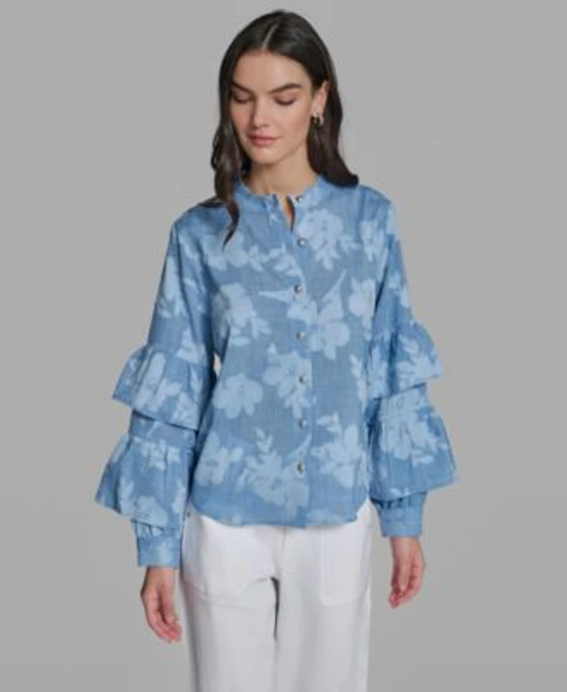 Elevate your wardrobe with this Karl Lagerfeld Paris blouse, designed with a chic mock neck. The tiered long-sleeves and front-buttons add elegant detail and movement, creating a sophisticated look.
