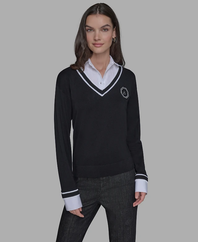 Karl Lagerfeld Paris Women's Twofer Patch V-Neck Sweater