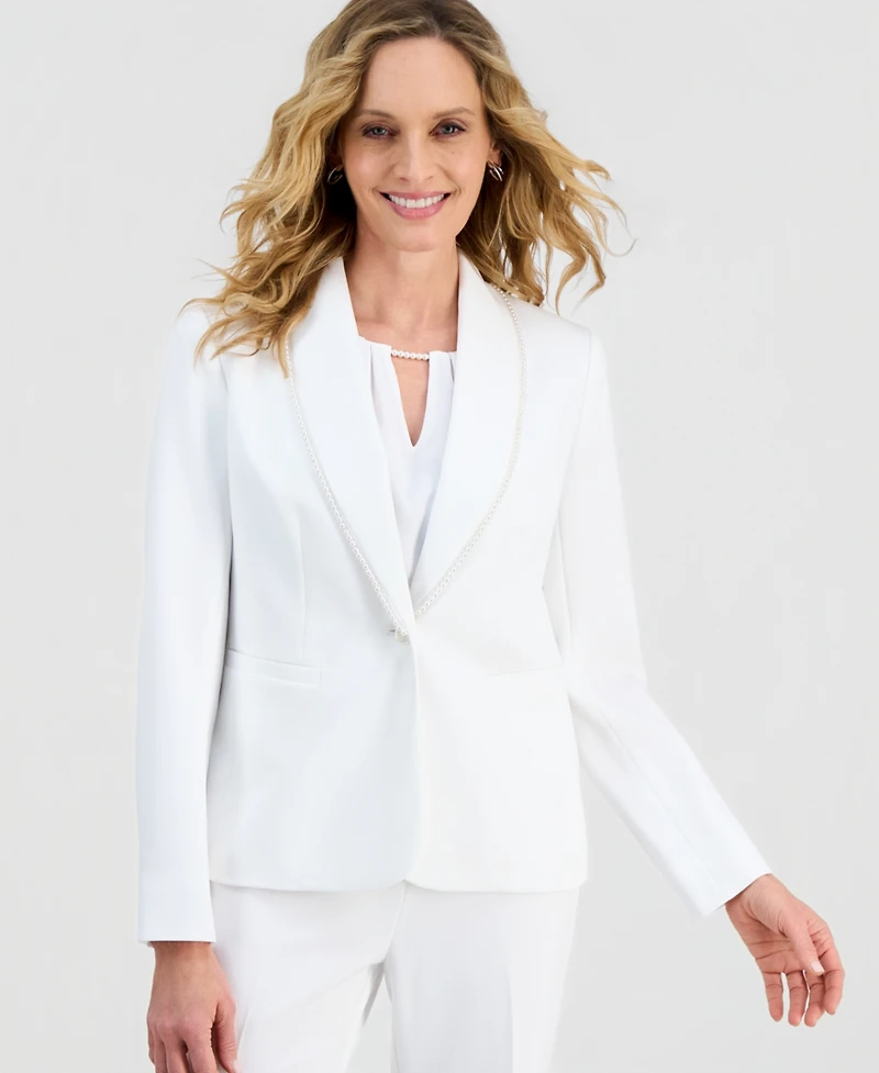 Elevate formal dressing with refined detail in this Kasper stretch jacket, styled for a chic, occasion-ready presence. An imitation pearl-trimmed shawl collar, single-button closure, long sleeves, and structured shoulders shape a polished, sophisticated profile.