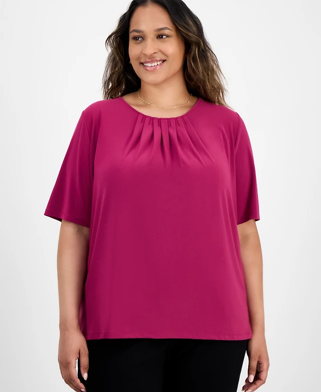 Kasper Plus Size Elbow-Sleeve Pleated-Neck Top