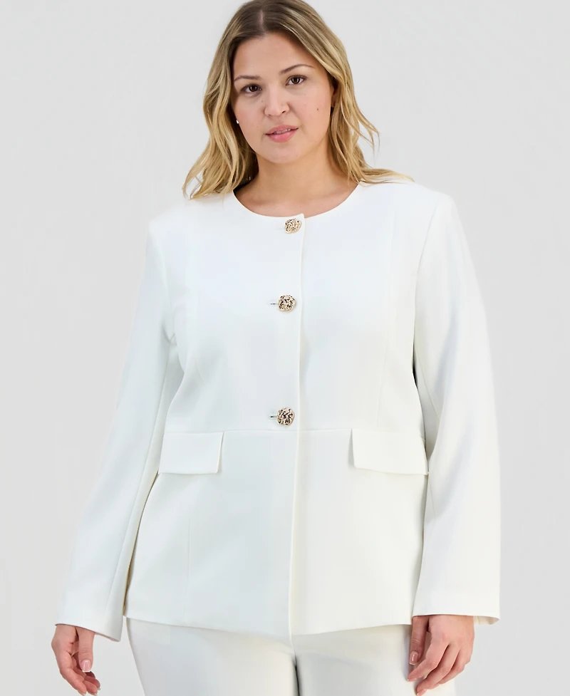 Define your professional look with this effortlessly chic plus size collarless button-front jacket from Kasper, perfectly tailored to provide a polish silhouette at the office.