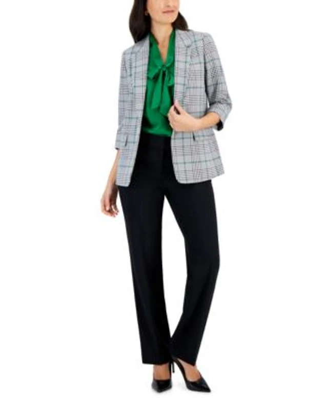 Kasper Womens Plaid Open Jacket Matte Satin Tie Neck Blouse Fly Front Pocket Trousers