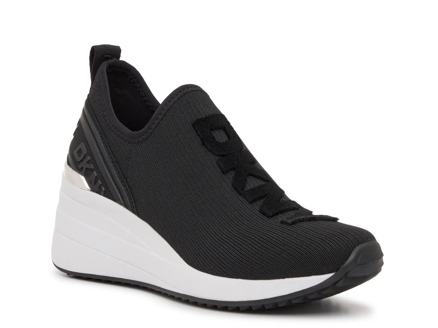 Step up your style with the DKNY Keeva sneaker. Featuring a comfortable slip-on design, textile upper, and a foam wedge heel, this casual shoe offers a padded footbed and sleek round toe for all-day wear with a touch of bold flair.