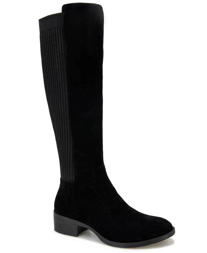 A classic genuine leather knee high boot gets a cozy, contoured feel with a rib knit throughout back of leg providing extra flexibility, coziness, and curves.