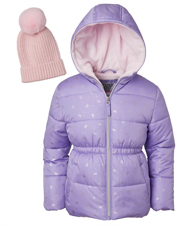 Kensie Girl Toddler and Little Girls Foil Bow Puffer Jacket with Beanie