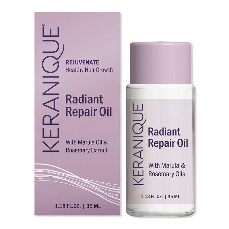 KERANIQUE RADIANT REPAIR OIL 1.7FLOZ. Benefits: Ultra lightweight oil treatment designed for fine & thinning hair. Fortifies, Nourishes, and Supports healthy-looking hair growth. Reduces hair loss due to breakage. Smooths flyaways and helps tame frizz. Adds brilliant shine. Key Ingredients: Marula Oil - helps protect against damage, locks in moisture and fortifies hair strands. Rosemary Extract - is known for its hair growth benefits. Formulated Without: Sulfates. Parabens. Gluten.