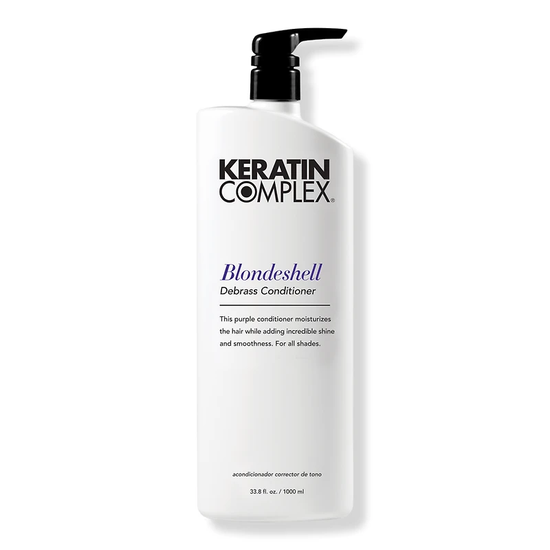 BLONDESHELL DEBRASS CONDITIONER 33.8OZ. Benefits: Purple formula brightens and debrasses hair color. Fade-fighting complex with chamomile helps to neutralize brassy hair and enhance beautiful cool tones. Formulated without sodium chloride to protect the longevity of Keratin Complex smoothing treatments. Can be used with or without a smoothing treatment. For all hair types and color shades. No added parabens. No added sodium lauryl sulfate (SLS). Key Ingredients: Powered by Keratin Complex's proprietary Signature Keratin and amino acids work to condition and protect fragile, over-processed, and damaged hair. Lavender oil encourages the growth of healthy hair. Blend of wheat and oat proteins increases hair's resilience to heat styling, sun damage, and daily aggressors. :