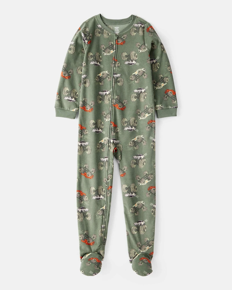Kid 1-Piece Monster Truck Fleece Footie Pajamas - Green