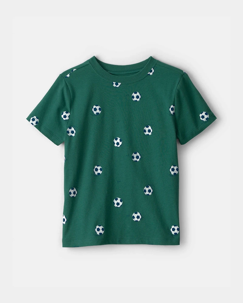 Get your little soccer star ready for action with this vibrant green T-shirt featuring a fun soccer-themed graphic. The short-sleeve design is perfect for warm days, ensuring comfort during playtime or casual outings. Made from soft jersey fabric, it promises all-day wear without irritation. Its versatile color easily pairs with any outfit, making it a go-to choice for soccer fans of all ages. Whether on the field or at home, this T-shirt is a must-have for active kids who love to show off their sporty style.