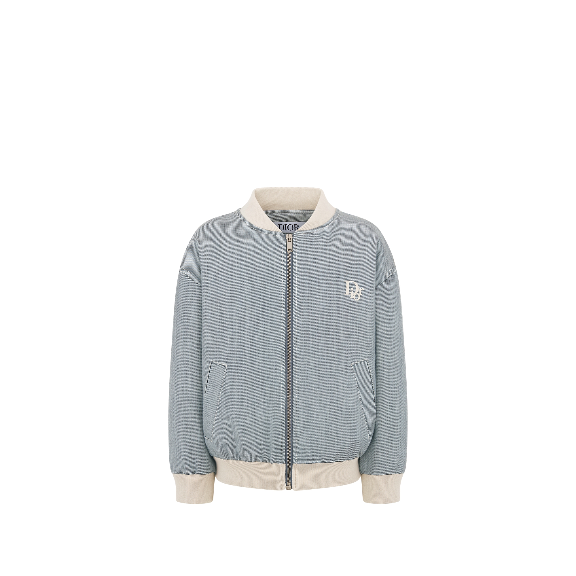 The bomber jacket stands out with its dynamic, laid-back style. Crafted in blue cotton twill, it is completed by contrasting beige ribbed details for a contemporary touch. Featuring slanted pockets and a metal zip closure, it is embellished with the Dior Oblique embroidery on the front. The bomber jacket will pair effortlessly with the matching Bermuda shorts or pants from the collection to create a playful look. Beige Dior Oblique embroidery on the front left. Front metal zip closure. Contrasting beige ribbed round neck, hem and cuffs. Beige topstitching. Slanted pockets. Main composition: 76% cotton, 24% polyester. Beige lining composition: 100% cotton