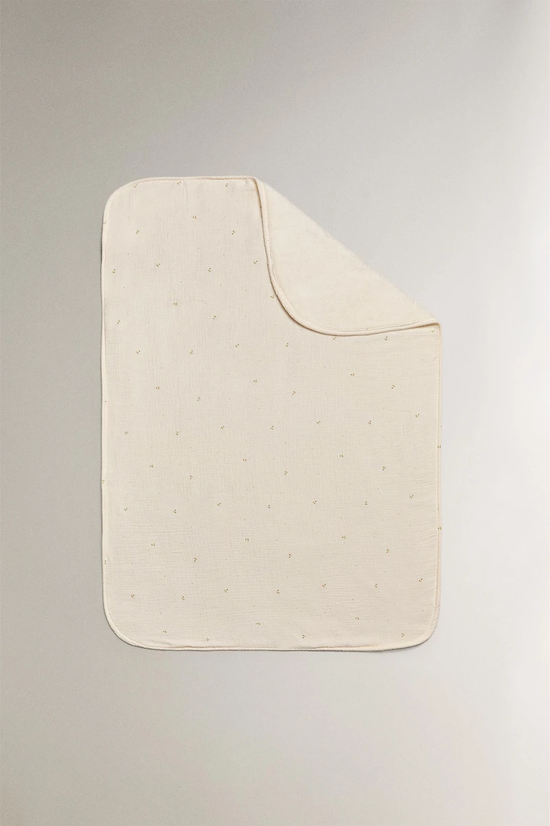 Kids blanket made of cotton chiffon with floral motifs distributed throughout the piece, and a fleece fabric reverse.