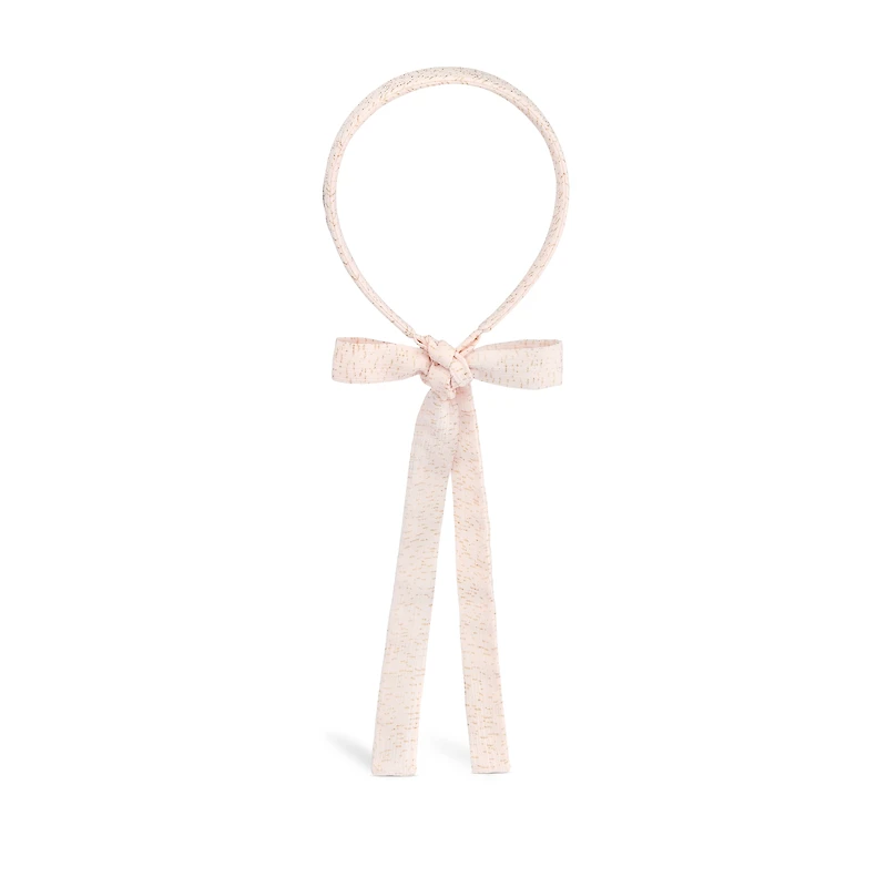 The headband features an original silhouette with a bow in the back. Crafted in pale pink crepe, it is printed with gold-tone glitter. Enhanced by a Dior bee embroidery on the side, the headband can be coordinated with matching pieces from the collection for a playful look. Dior bee embroidery in gold-tone metallic thread on the side. Tonal ribbons tied in the back. Main composition: 100% polyester. Tonal crepe de chine lining composition: 90% acetate, 10% silk