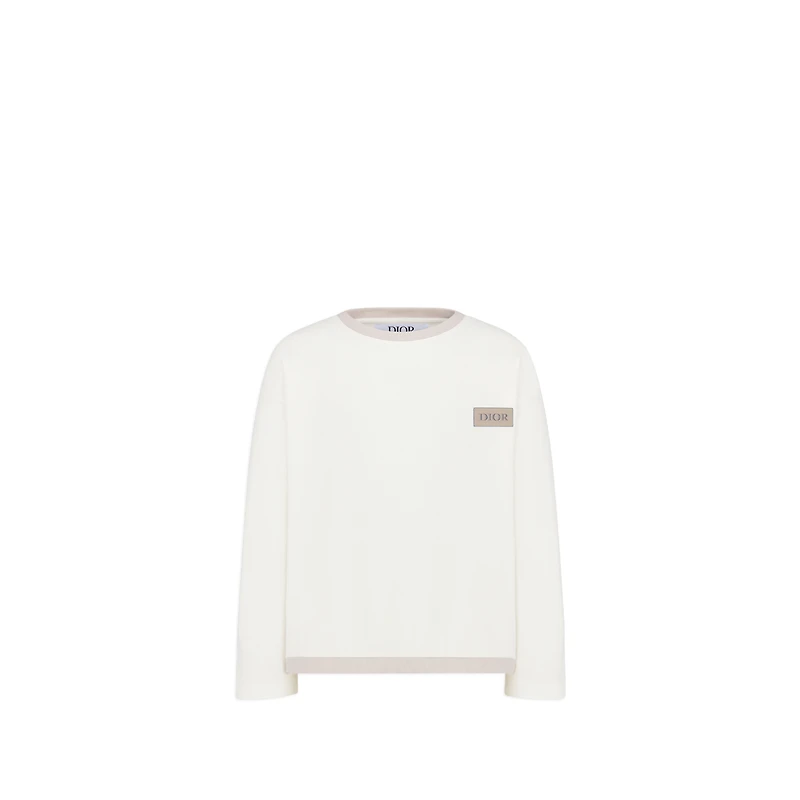 The long-sleeved T-shirt offers a streamlined silhouette. Crafted in ivory cotton jersey, it is elevated by a contrasting beige ribbed crew neck and hem. Adorned with a beige and blue leather Dior patch on the front, the T-shirt can be worn with track pants or jeans from the collection for a laid-back look. Beige and blue leather Dior patch on the front. Beige ribbed crew neck and hem. Composition: 96% cotton, 4% elastane. Unlined