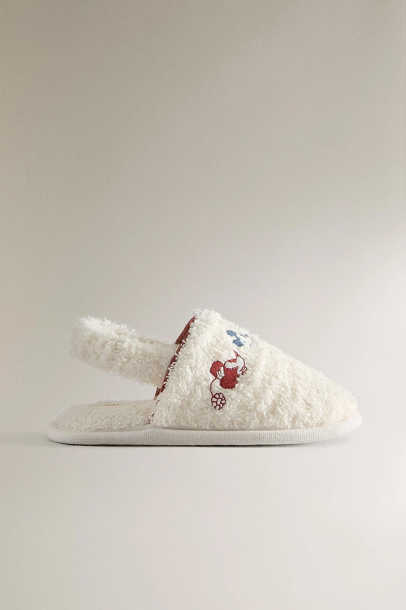 Kids' house slippers made of towel fabric. Featuring a printed detail of Mickey & Minnie Mouse ©Disney characters. Includes an elastic strap for a better fit. Ideal for the bathroom.