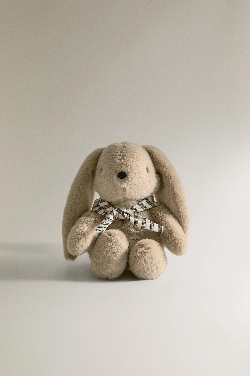 Kids plush toy in the shape of a small rabbit. It comes in a small box that can be opened, allowing the plush toy to be easily stored and removed.