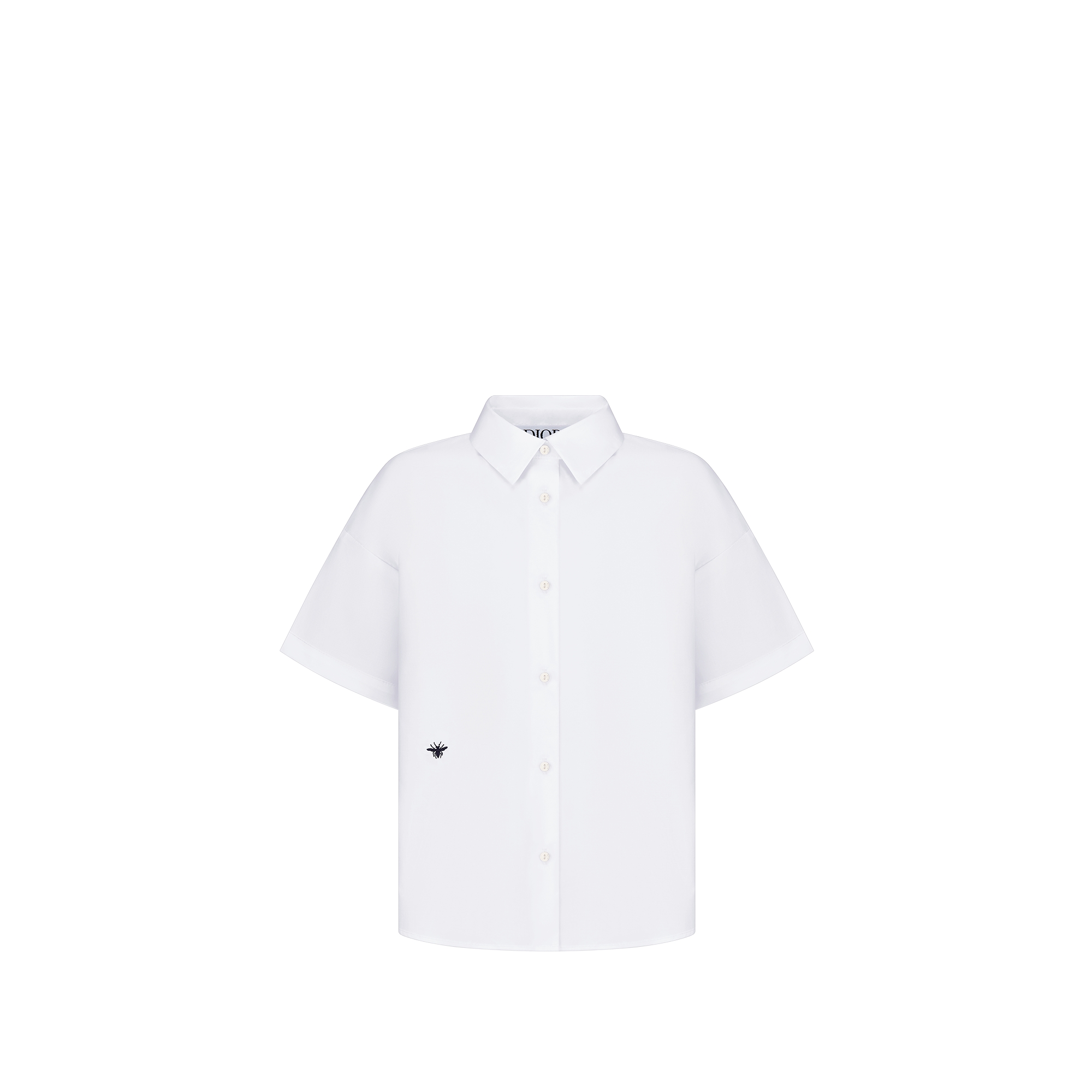 This season, the timeless white shirt is revisited in a short-sleeved variation. Crafted in cotton poplin, it is distinguished by its fine woven construction, offering resistance, comfort and softness. Embellished with the House's hallmark black embroidered bee at the waist for modern and chic appeal, the ethereal shirt is stunning for any occasion. Black bee embroidery at the waist. Button placket with Dior-engraved white buttons. Composition: 95% cotton, 5% elastane. Unlined