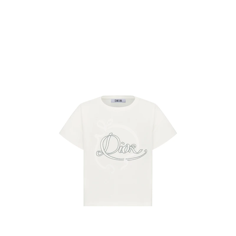 The T-shirt offers a comfortable silhouette with dropped shoulders. Crafted in ivory cotton jersey, it is embellished with a tonal and silver-tone Dior ribbon embroidery on the front. Completed by a ribbed crew neck, the T-shirt will pair effortlessly with pants or a skirt from the collection for a delicate look.