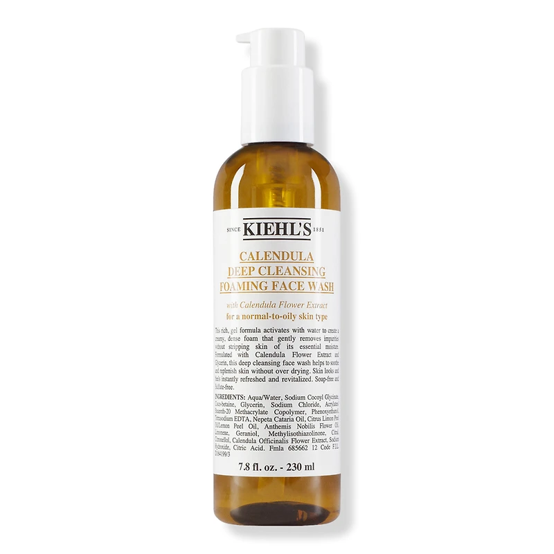 CALENDULA FACE WASH 7.8OZ. Benefits: Gently lifts away impurities, dirt and oil. Deeply cleanses skin without over drying or stripping. Help skin look and feel instantly refreshed and revitalized. Made with recyclable packaging. Key Ingredients: Calendula: native to the Mediterranean, known for skin soothing properties and commonly used in skincare products for oily skin types. Glycerin: a well-known skincare ingredient, is highly compatible and naturally occurring within skin; within Kiehl's formulas, it is a powerful humectant known to help retain moisture and soften skin. :