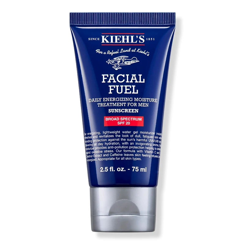 FACL FUEL MOISTURIZER SPF 20 200ML 6.8OZ. Benefits: This men's SPF moisturizer re-energizes and invigorates fatigued, dull skin. Formulated with Caffeine and Vitamin C & Vitamin E, Kiehl's men's face lotion with SPF 20 provides antioxidant protection in addition to softening and refreshing skin. Smooth on non-greasy hydration and experience the fresh scent of he Kiehl's re-energizing men's SPF moisturizer. Paraben-free & Sulfate-free. Features: Refuels, re-energizes and revives men's skin for an invigorated, healthy appearance. Delivers non-greasy hydration. Helps men's skin resist environmental aggressors with anti-pollution protection. Formulated with broad-spectrum protection against UVA and UVB rays. Made with recyclable packaging. Key Ingredients: Caffeine: an alkaloid known for its stimulating properties; it helps energize and reduce dullness. Chestnut Extract: derived from the sweet chestnut tree native to Europe and Asia; this extract contains antioxidants that help to effectively neutralize free radicals. Vitamin Cg: a vitamin C derivative that activates once absorbed into the upper layers of the skin's surface; with antioxidant benefits, it's frequently used in anti-wrinkle skincare products to help reduce facial lines over time.
