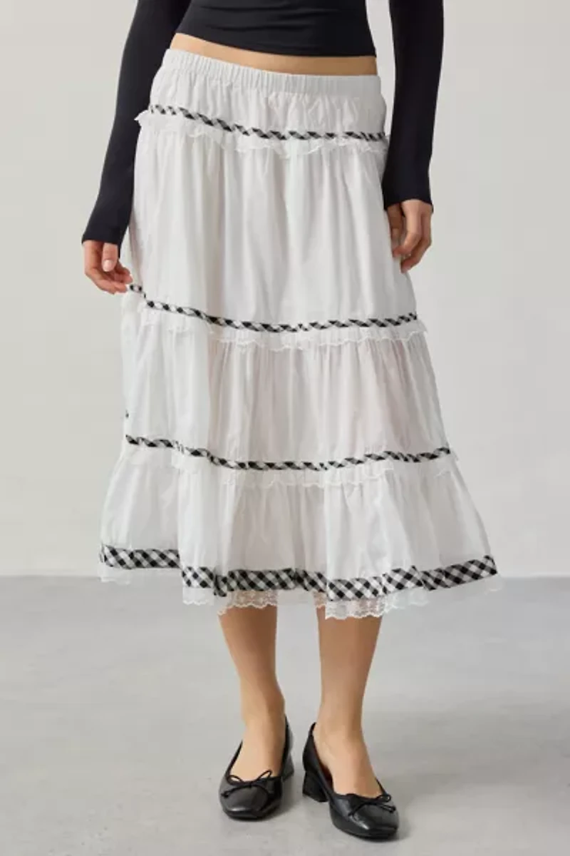Twirl-worthy Kimchi Blue midi skirt in a tiered, a-line silhouette. Cotton midi skirt designed with a low-rise, elasticated waistband and a full tiered skirt topped with ribbon and lace trims for a femme finish. Try it styled with tees, blouses and knits for endless cute outfit ideas! Only at UO.