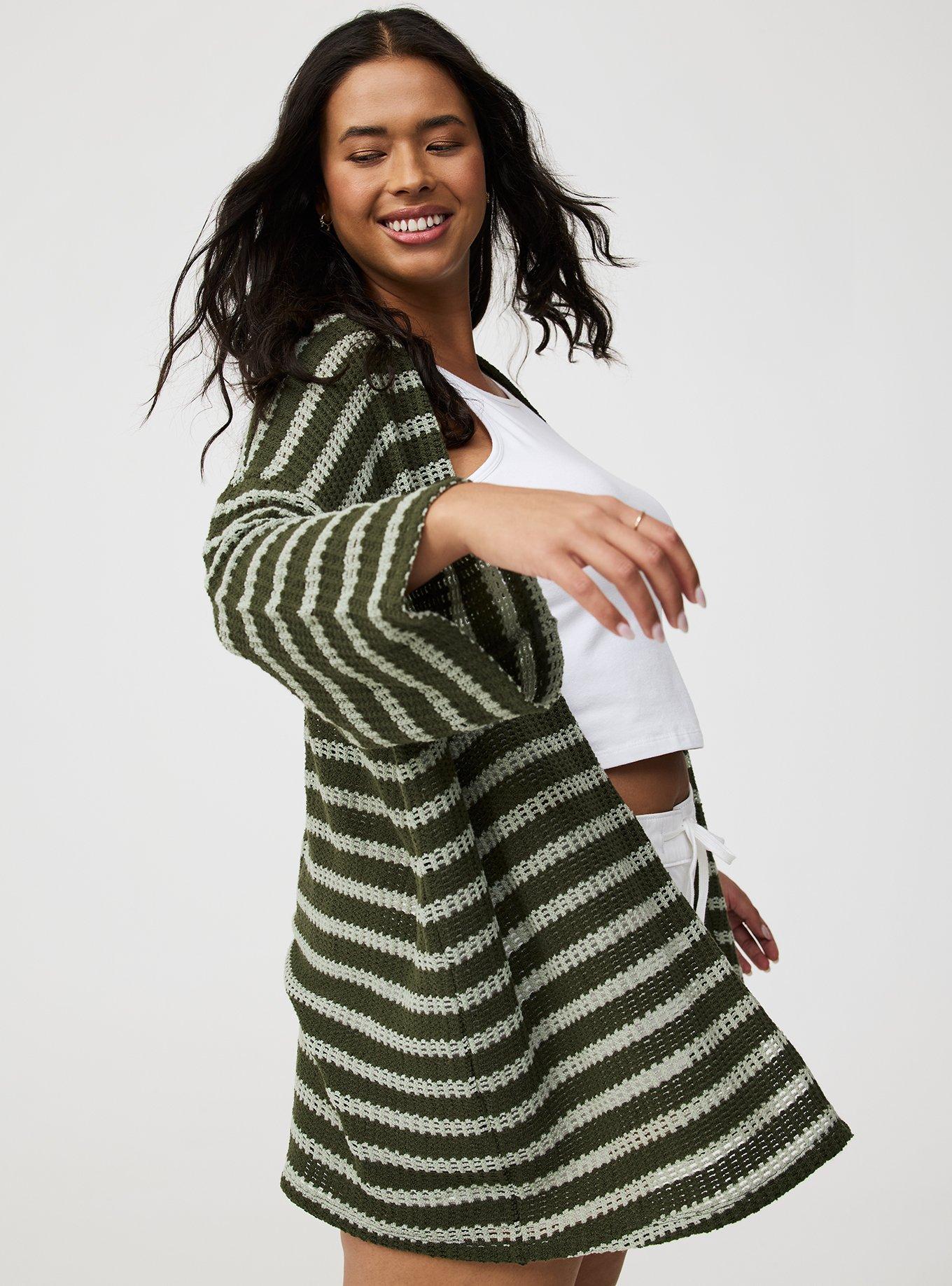 FIT Relaxed fit. Kimono style sleeves. Measures 32'' from shoulder (size 2), MATERIALS + CARE Yarn knit fabric. 59% cotton, 40% polyester, 1% spandex. Machine wash cold. Line dry. Imported. DETAILS Open front. Long sleeves.