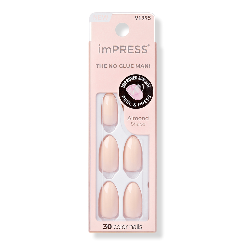 IMPRESS CLR PRESS ON NAILS BRUSHED PALE. Features: The NO GLUE Mani - just peel, press & go. Solid color pink press-ons are medium length & almond shaped. PureFit Technology for a super slim, comfortable fit. Waterproof, super durable, & no polish required. Includes: 30 Fake Nails. Prep Pad. Mini Nail File. Manicure Stick. :