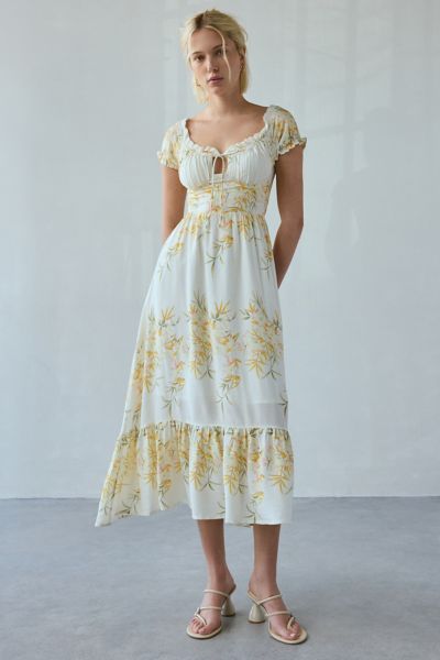 Flowing Kiss The Sky midi dress in an a-line silhouette. Milkmaid dress designed in a delicate floral print with a ruffled scoop neckline, short puff sleeves and a keyhole tie-front detail at the bust. Finished with a tiered hem for added movement.