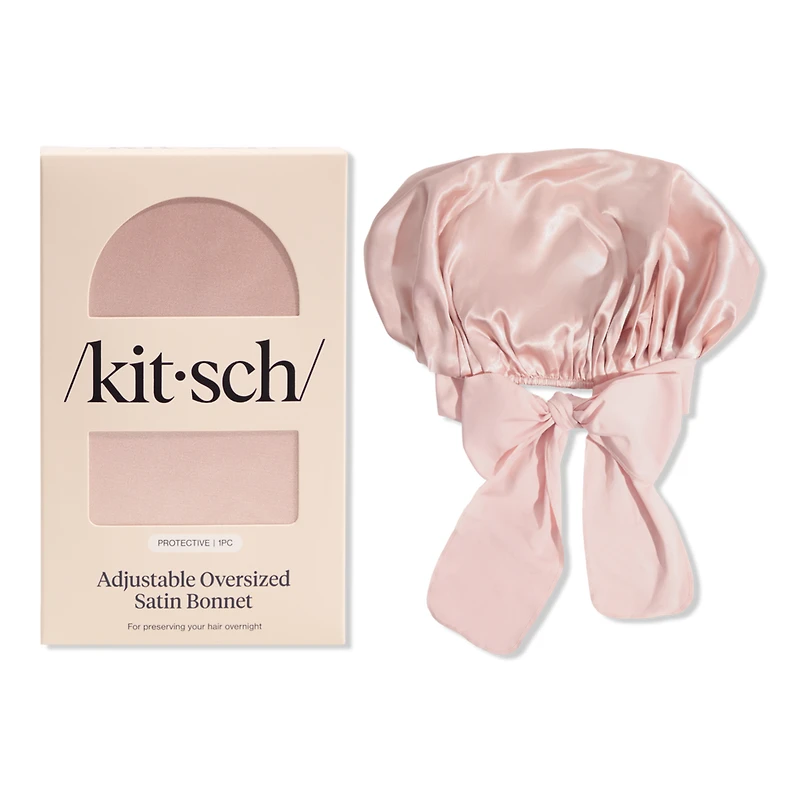 ADJUSTABLE OVERSIZED SATIN BONNET BLUSH. Benefits: Helps maintain hair health by reducing friction, breakage, and frizz. Roomy fit preserves your hairstyle while you sleep, whether you are pairing with your Kitsch Heatless Curlers or have thick 4C curls. Satin helps lock in moisture and your natural oils, keeping your hair soft and tangle-free. Adds a touch of glamour to your bedtime routine. Features: High-quality, double-layered satin cares for your hair while you sleep. Suitable for most hair types, including long and curly hair. Extra-long, adjustable ties designed to give you a secure fit. :