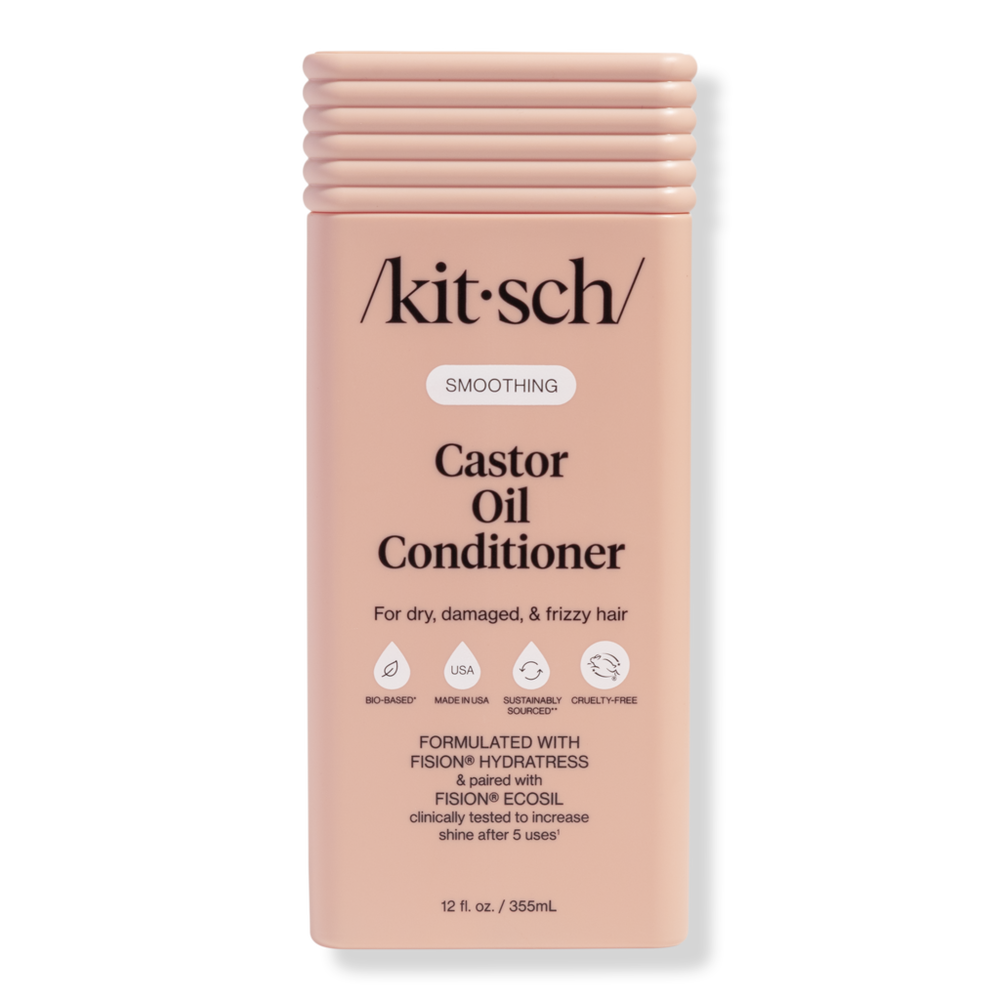 SMOOTHING CASTOR OIL CONDITIONER 12.0OZ. Benefits: Nourishes and smooths dry, damaged, & frizzy hair to reveal hair that looks as healthy as it feels. Deeply smooths. Infused with Castor Oil to support healthy, nourished-looking hair. Powered by Fision HydraTress and Fision EcoSilan up-cycled silicone alternativeclinically tested to boost manageability and shine in just 5 uses.. Nourishing. Helps nourish and revive dry, damaged, & frizzy hair to promote soft, smooth strands that look as healthy as they feel.. Brings balance. Hair needs both moisture and proteinmoisture keeps it soft, while protein adds strength. If your hair feels stiff or brittle from protein overload, alternating with Kitsch Smoothing Castor Oil Conditioner helps restore that balance.. Healthier-Looking Hair. Using both moisturizing and protein-rich products in the right ratio for your hair type can help reduce breakage, improve manageability, and keep your hair looking and feeling its best.. Features: Formulated with Castor Oil known to enhance the appearance of healthy, nourished-looking hair. Formulated with Fision HydraTress and paired with Fision EcoSil, a naturally derived, up-cycled silicone alternative, clinically tested to increase shine after 5 uses. 96% Bio-based formula. Free of parabens, phthalates, silicones, SLS & SLES. Made in USA, color-safe. Fully recyclable packaging and made with PCR (post-consumer recycled) material. Packaging may vary. :