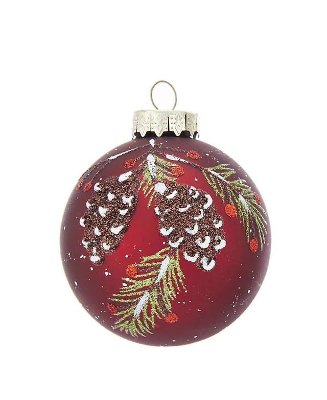 Kurt Adler 80MM Glass Red With Pinecone Design Ball Ornaments, 6 Piece Box Set