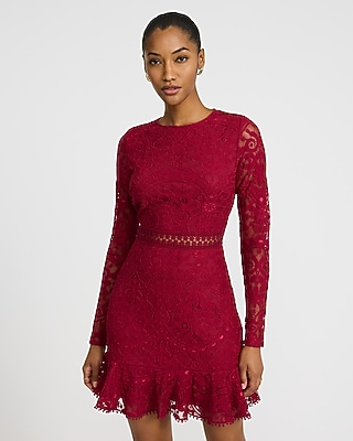 An ornate lace fabric makes this mini dress a style standout. It features a crew neck with sheer long sleeves, a sheer waist detail, and a ruffle hem. Plus, this style boasts a tie back closure with a partially open back.