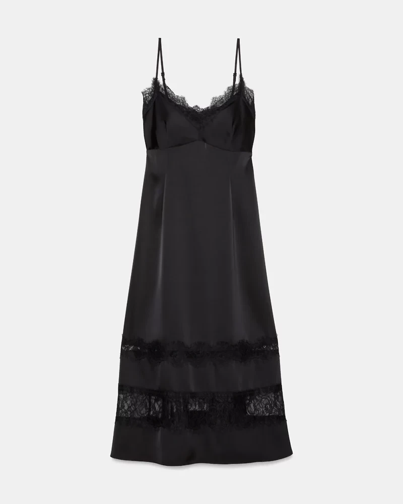 From desk to dinner: layer this slip dress with a tailored jacket or wear solo for evenings out. A fitted bodice and subtle-flare skirt create a polished shape, while delicate lace at the neckline gives this satin dress a feminine finish.