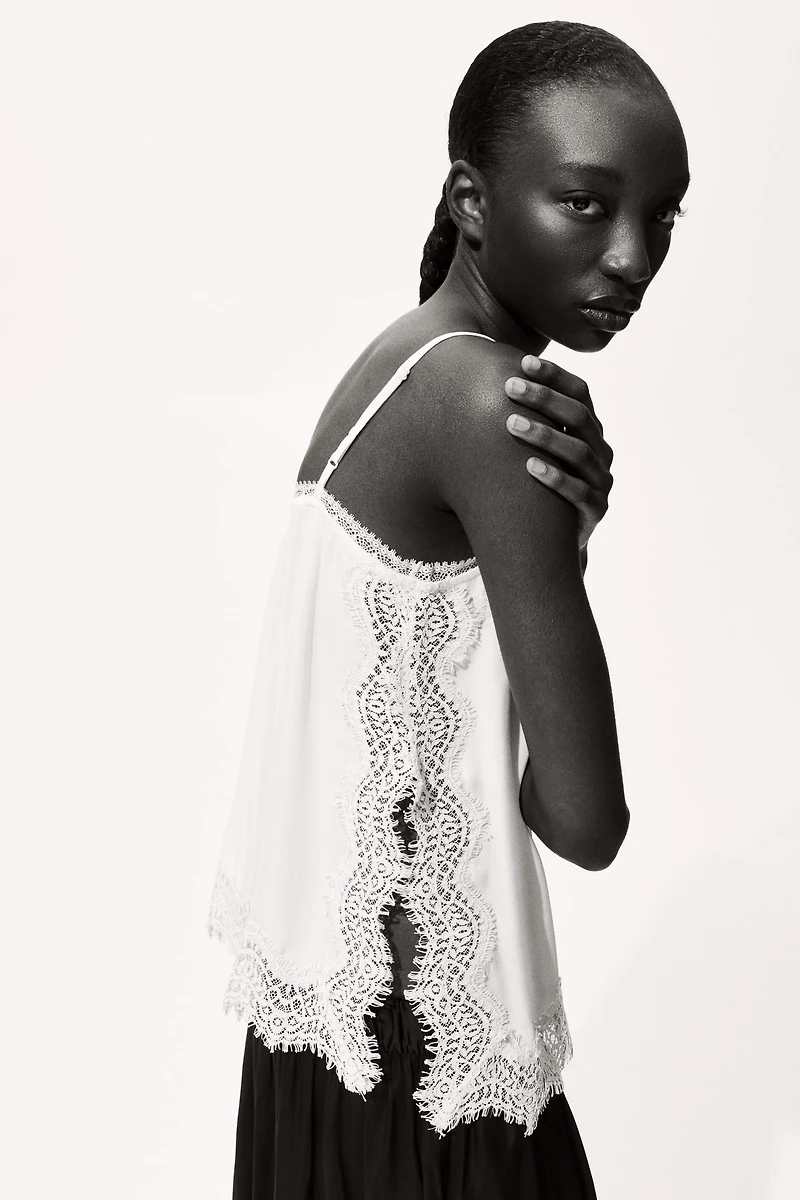 Top in woven fabric with lace trim and pintucks. Narrow, adjustable shoulder straps, straight neckline, and scalloped-edge hem.