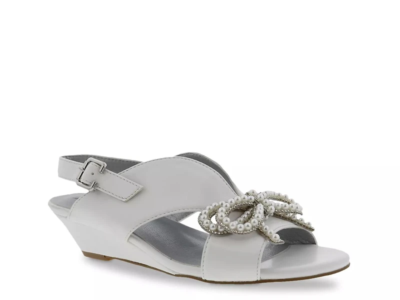Enhance your style score with the Lady wedge sandal from Bellini. Smooth pearl embellished bow detail adorns this vegan synthetic sandal designed with an adjustable slingback strap, comfy foam padded footbed and a low wedge.
