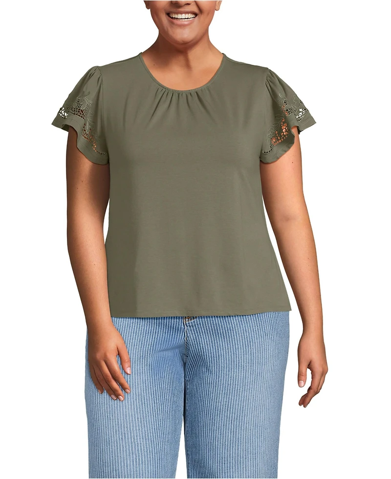 Lands' End Women's Plus Lightweight Jersey Crew Neck Ruffle Sleeve Flowy Top