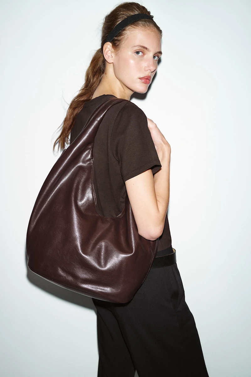 Large bucket-style shoulder bag. Shoulder strap. Side pocket with zipper. Pull tab detail. Interior zipper pocket. Magnetic closure.