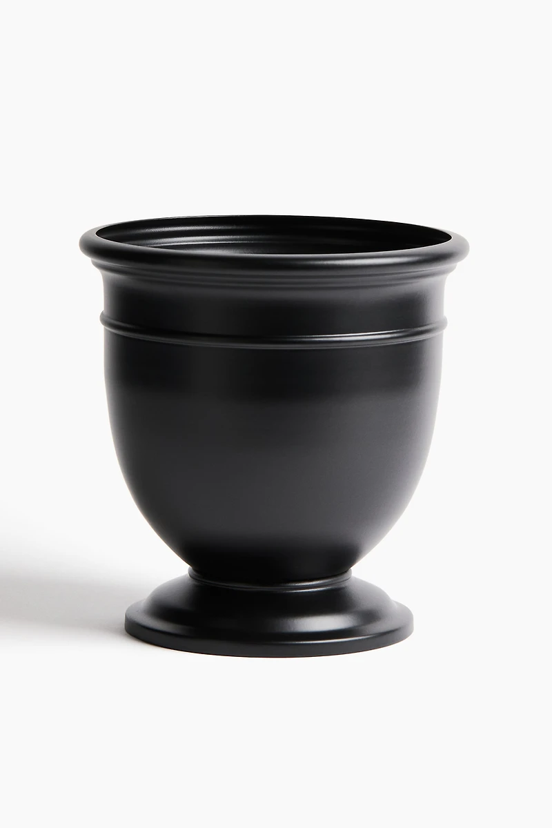 Large, footed plant pot in metal with a drainage hole in base, suitable for both indoor and outdoor use. Indoor storage when outdoor season ends will help keep it in good condition.