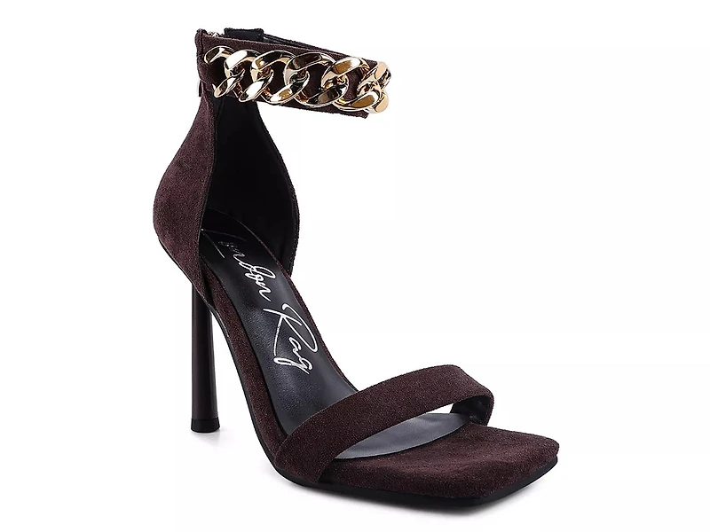 Grace your feminine outfit with the Last Sip sandal by London Rag. Metal chain link on the ankle strap brings the blingy element to this plush, zipper sandal elevated by a unique cylindrical heel.