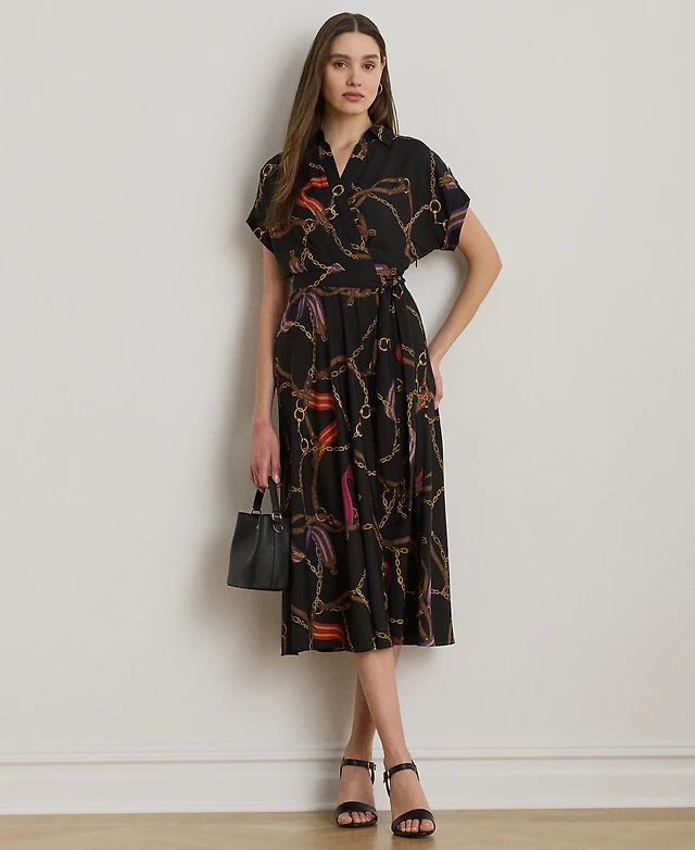 Lauren Ralph Lauren Petite Spread Collar Belting-Print Dress