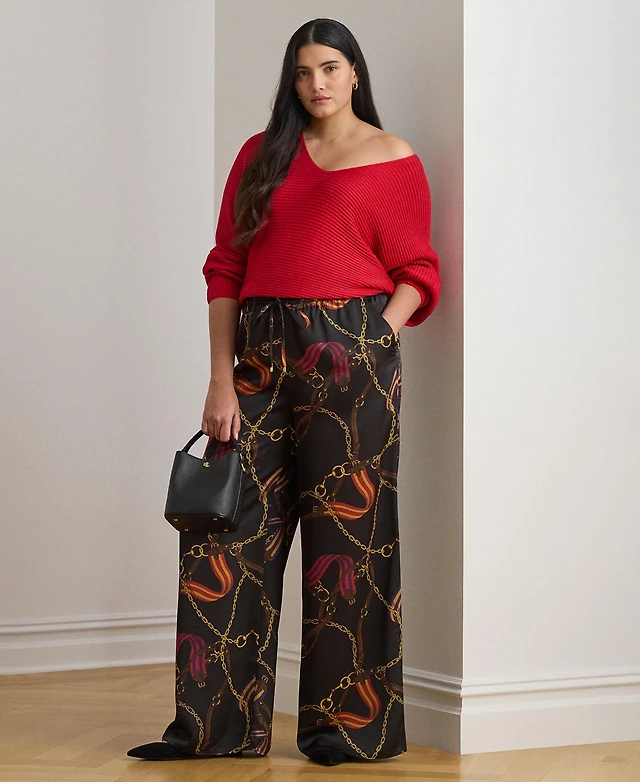 Lauren Ralph Plus Belting-Print Charmeuse Wide-Leg Pant