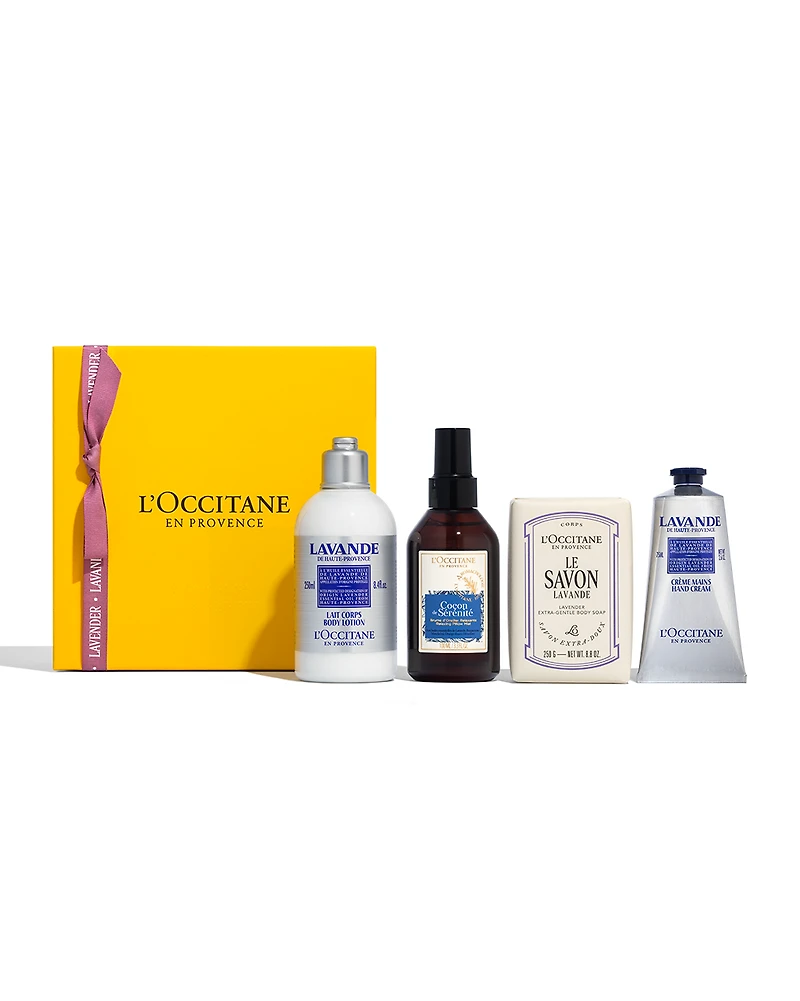 Perfect the art of self-care with the relaxing aroma of Lavender. Set comes preassembled in L'OCCTAINE's signature yellow box and includes: Le Savon Shea Lavender Extra-Gentle Body Soap (formerly known as Shea Lavender Extra-Gentle Soap) 250G/ Net wt. 8.8 oz. Delicately cleanses the skin and envelops you in the relaxing and soothing notes of lavender. Lavender Body Lotion 250ml/ 8.4 fl. oz.: Infused with organic Shea Butter, this body lotion leaves skin soft, supple and pleasantly scented. Lavender Hand Cream 75ml / Net wt. 2.6 oz.: This smooth, light-textured cream helps to nourish and lightly perfume hands. Cocon De Sérénité Relaxing Pillow Mist 100ML/ 3.3 fl. oz.; With a blend of essential oils, this aroma creates a calming atmosphere that helps promote a sense of relaxation.