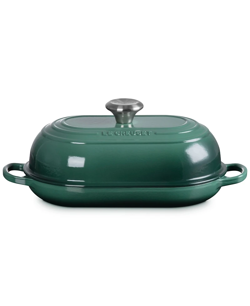 Elevate your baking game with this Le Creuset Signature oval bread oven crafted from enameled cast iron. The tight-fitting domed lid traps steam to create a golden, crispy crust, while the low-profile base guarantees even browning. The patina that develops over time enhances performance, making every bake even better.