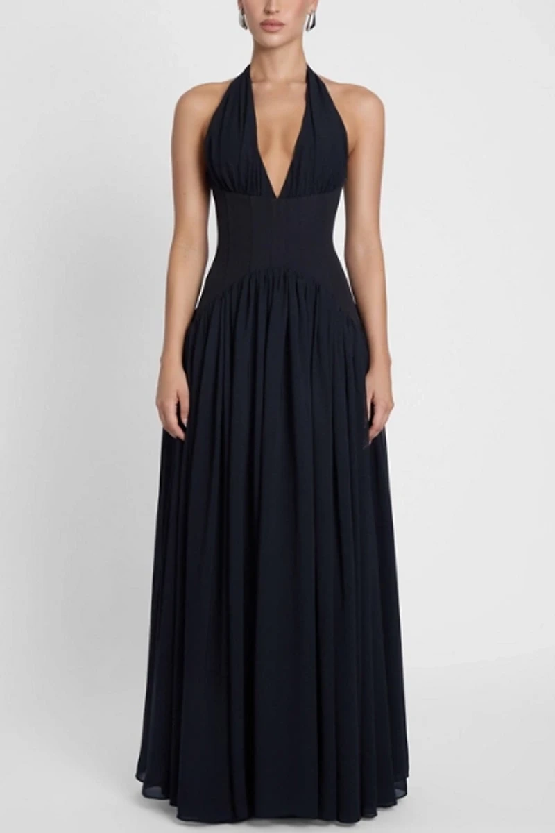 This halter maxi dress is crafted from premium chiffon with delicate gathering at the neckline and below the structured corset waist that sculpts your figure while creating striking contrast.