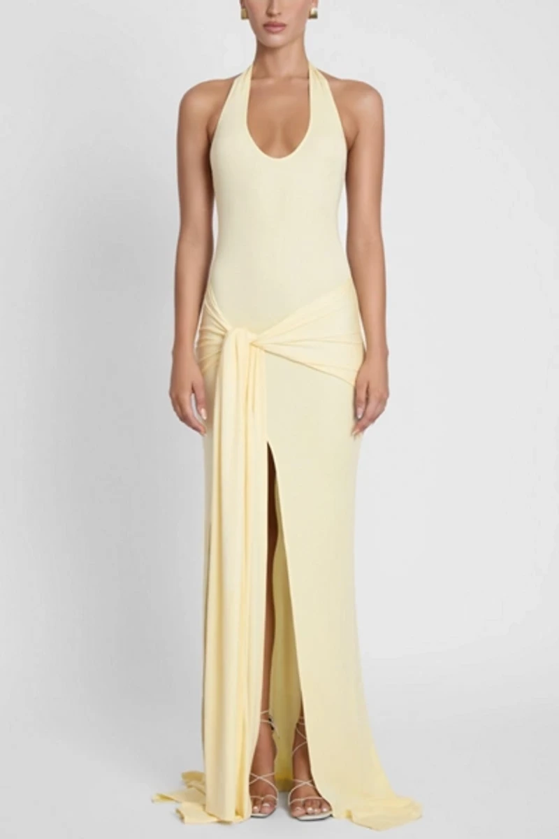 This halter maxi dress is crafted from ultra-soft premium jersey with a plunging neckline and sarong-style knot drape overlay at the hips while the unlined design allows fluid movement.